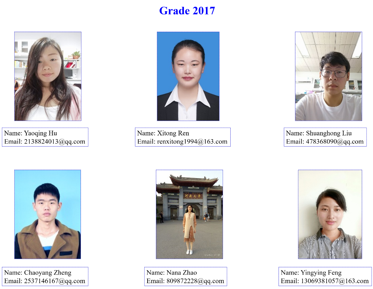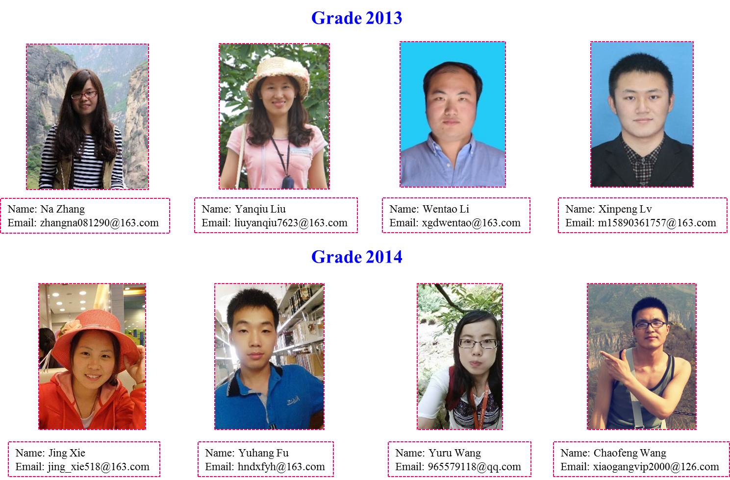 uEducation and Work experience: 1. 9/2007-7/2011, College of Materials and Chemical Engineering, China Three Gorges University, Bachelor of Science 2. 9/2011- 6/2014, Key Laboratory for Special Functional Materials of Ministry of Education, Henan University, Master of Science 3. 9/2014-6/2017, The Key Laboratory of Natural Medicine and Immuno-Engineering, Henan University, Doctor of Science 4. 7/2017-present, Key Laboratory for Special Functional Materials of Ministry of Education, Henan University uResearch Interest: nanostructure-based self-assembly of porphyrin, Z-scheme photocatalyst and atomic layer deposition. uE-mail: ResearcherID N-1586-2014. ORCID ID //orcid.org/0000-0003-1446-3148. uPulications: 1. Jiefei Wang,Yong Zhong, Xiao Wang, Weitao Yang, Feng Bai*, Bingbo Zhang*, Leanne Alarid, Kaifu Bian, and Hongyou Fan*. “pH-Dependent Assembly of Porphyrin-Silica Nanocomposites and Their Application in Targeted Photodynamic Therapy.” Nano letters, 2017, 17 (11): 6916–6921. 2. Jiefei Wang,Yong Zhong, Liang Wang, Na Zhang, Ronghui Cao, Kaifu Bian, Leanne Alarid, Raid E. Haddad, Feng Bai*, Hongyou Fan*. Morphology-Controlled Synthesis and Metalation of Porphyrin Nanoparticles with Enhanced Photocatalytic Performance. Nano Letters, 2016, 16 (10): 6523-6528. 3.Yong Zhong, Jiefei Wang, Ruifang Zhang, Wenbo Wei, Haimiao Wang, Xinpeng Lü, Feng Bai*, Huimeng Wu, Raid Haddad, Hongyou Fan*. Morphology-Controlled Self-Assembly and Synthesis of Photocatalytic Nanocrystals. Nano Letters, 2014, 14 (12): 7175-7179. 4.Yong Zhong, Zixuan Wang, Ruifang Zhang, Feng Bai*, Huimeng Wu, Raid Haddad, Hongyou Fan*. Interfacial self-assembly driven formation of hierarchically structured nanocrystals with photocatalytic activity. ACS Nano, 2014, 8 (1): 827-833. Students in the group