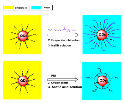 我们分别利用两亲性有机物小分子修饰和配体交换的方法得到两种荧光强度高、稳定性好、表面带大量相反电荷的水相量子点。并在此基础上,采用层层自组装技术,分别得到红色、绿色、蓝色全量子点发光薄膜,该全量子点薄膜避免了聚合物层对量子点发光性能的影响,结构高度均匀有序、光热稳定性高、发光强度和颜色精确可控。通过精确调节三种颜色比例,得到多色以及白色发光薄膜。该薄膜的荧光强度随组装层数n线性增强,具有较高的可见光透过率,且白色薄膜色坐标为(0.3292, 0.3418), 属于高质量白光光源。该发光薄膜在新型生物传感器、多色显示器、智能响应和光电子器件有潜在的应用。