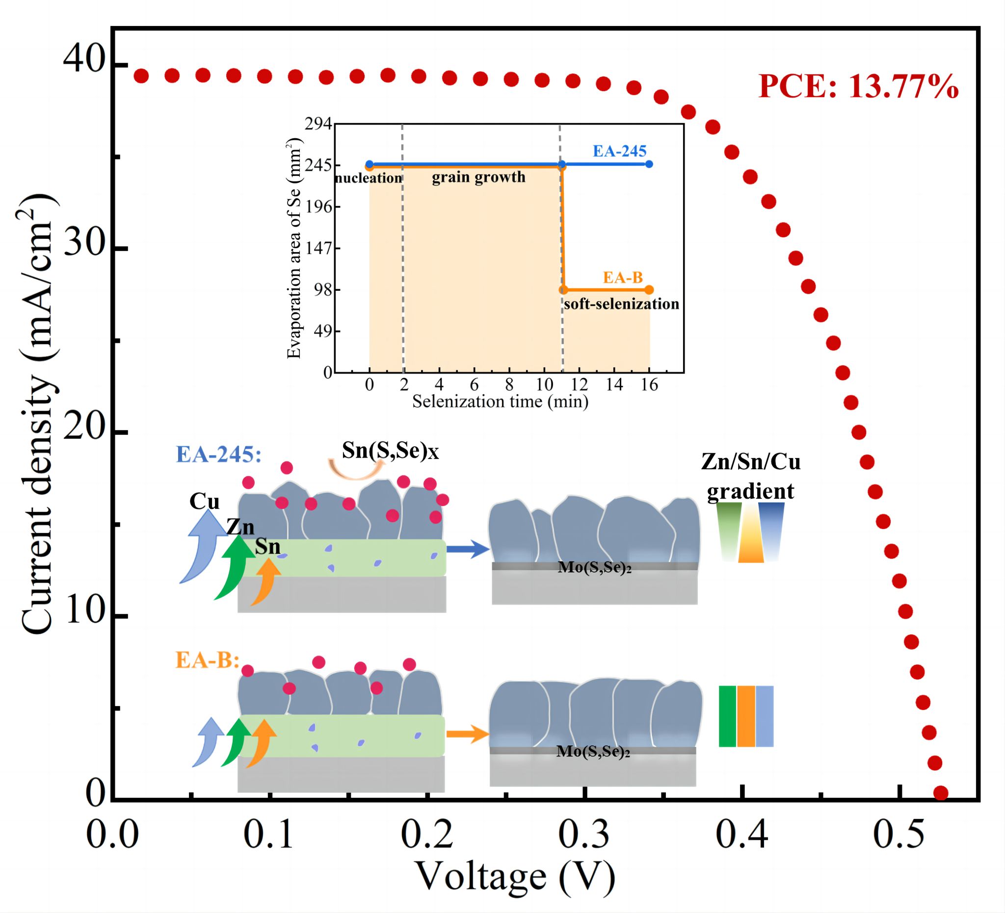 此外,体相内大量的深能级缺陷同样限制着CZTSSe光伏器件开路电压和转换效率的进一步提高。制备具有低缺陷浓度的高质量吸收层对于改善CZTSSe光伏性能至关重要。然而,由于硒化反应的不可控性和薄膜生长硒化环境的复杂性,高质量吸收层的制备仍面临严重的挑战。我们创新性的提出了一种硒化环境的分段调控策略,即在硒化初始阶段提供较大的硒蒸发面积促进薄膜的快速相变反应及晶粒生长,在硒化后期提供较小的硒蒸发面积创造一个软硒化环境,抑制Sn元素损失并促进元素均匀化,从而缓解元素失衡引起的Sn相关深能级缺陷的增殖。结晶性和缺陷的协同优化,抑制了严重的非辐射复合并增强了载流子的传输和收集,从而改善了电池的开路电压,将CZTSSe的效率提升至13.77%。(第一作者:简玥;通讯作者:河南大学武四新教授,韩力涛讲师,深圳大学梁广兴教授)
