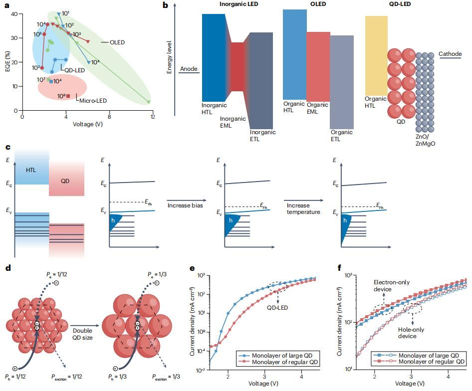 量子点发光二极管器件(QLED)有望成为新一代主流发光显示技术。自1994年以来,研究者们在提高QLED的外量子效率和寿命方面取得了巨大进展,对器件工作和老化机制的理解也越来越深入。然而,仍有一些关键问题有待澄清,例如正老化的起源以及ZnO纳米颗粒在实现器件高性能方面的作用。针对以上问题,研究团队与中国科学技术大学合作,综述了影响QLED的电压、内量子效率和光子输出耦合效率的关键因素。并指出了影响无镉QLEDs和蓝光QLEDs性能的物理机制,也汇集了TCL等公司在产业化进程中所遇到的挑战。研究成果以“Advances in understanding quantum dot light-emitting diodes”为题,发表在Nature Reviews Electrical Engineering期刊上。中科大博士研究生李波、河南大学陈斐博士为共同第一作者,中科大樊逢佳教授、河南大学申怀彬教授为共同通讯作者。