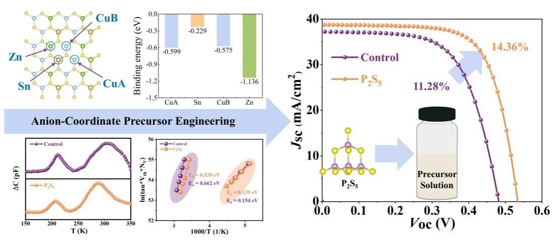 提高吸收层薄膜结晶质量和钝化深能级缺陷对于改善CZTSSe太阳能电池的器件性能至关重要。Cu-Zn-Sn-S前驱体溶液中的配位分子相互作用对CZTSSe薄膜的结构缺陷和结晶动力学有重要影响。因此,如何通过调控前驱体溶液中阴阳离子配位环境来控制前驱体薄膜的形成过程是目前面临的一个重大挑战。在这里,我们通过在CZTS前驱体溶液中加入五硫化二磷(P2S5, P=S)作为添加剂以优化配位结构,从而改善吸收层薄膜的结晶过程并钝化深能级缺陷。理论计算和实验结果表明,P2S5分子可以配位到CZTS前驱体薄膜的金属阳离子位点,特别是更容易和Zn2+键合,从而显著降低了CZTSSe吸收层中与锌相关的缺陷密度。最终实现了能量转换效率为14.36%的太阳能电池器件。本工作为阴离子配位调控制备高质量吸收层薄膜提供了一种可行的策略,为实现高效CZTSSe光伏器件提供了一条新的途径。