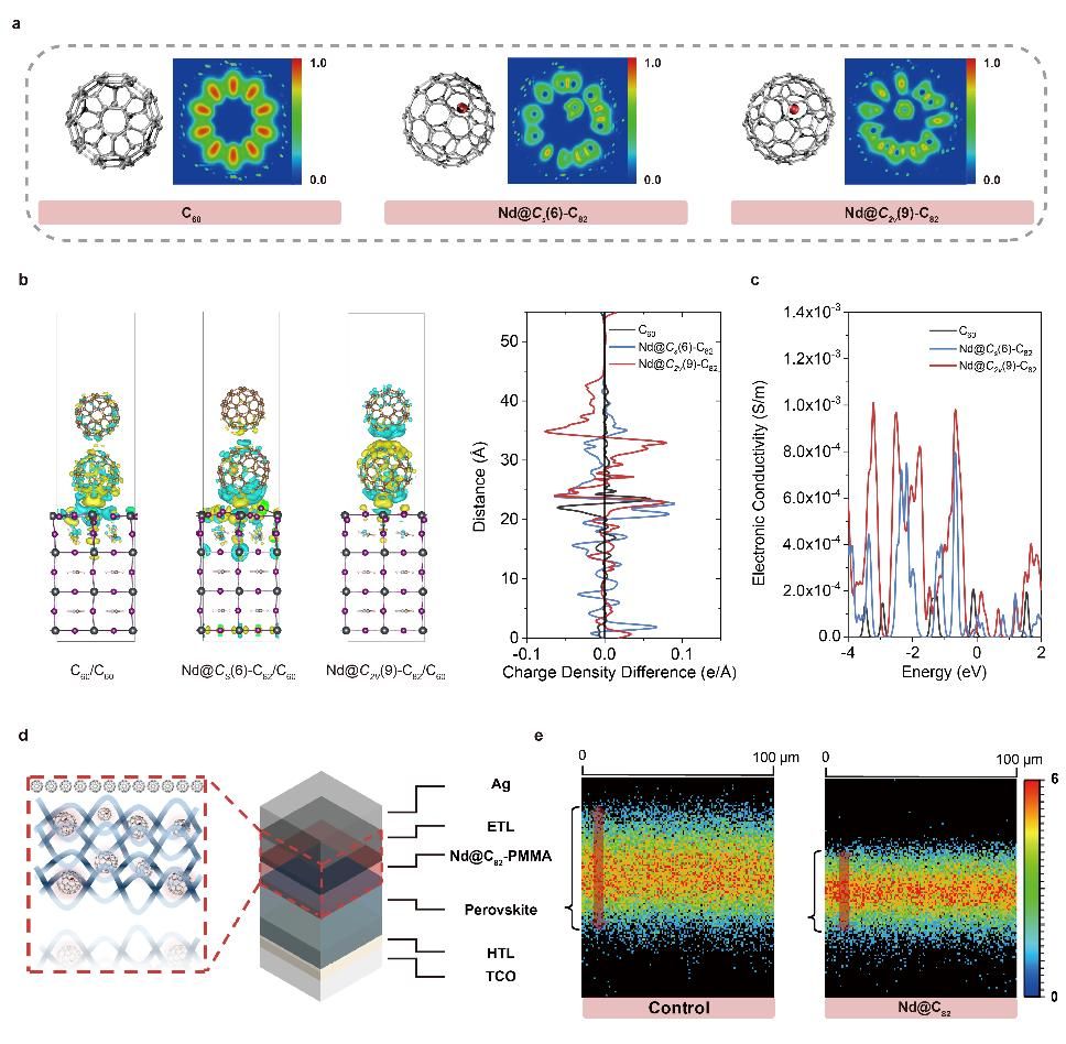 1 内嵌金属富勒烯Nd@C82-聚甲基丙烯酸甲酯(PMMA)耦合层助力超快电子提取和离子扩散抑制。(a)C60,Nd@Cs(6)-C82,以及Nd@C2v(9)-C82的分子结构以及相应的电子局域化函数(ELF);(b)钙钛矿/富勒烯的电荷密度差分布(CDD);(c)计算出的不同富勒烯电子电导率;(d)具有Nd@C82-PMMA耦合层的倒置钙钛矿太阳能电池(PSC)的器件结构示意图;(e)横截面飞行时间二次离子质谱图。