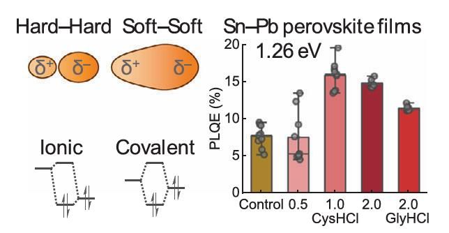 针对上述问题,河南大学李萌教授团队首次提出用“硬-软酸碱(HSAB)原理”定向调控Sn-Pb混合钙钛矿前驱体溶液中的金属中心物种。在钙钛矿前驱体溶液中引入同时带有硬碱(羧基,-COOH)与相对软碱(巯基,-SH)的盐酸半胱氨酸(CysHCl),以分别偏好作用于较“硬”的Sn²⁺与较“软”的Pb²⁺,实现对两类金属物种的调控。最终,经CysHCl改进后实现了光电转换效率为23.3%的铅锡钙钛矿太阳能电池器件,且在25℃下对最大功率点追踪285h后仍有初始效率的80%,在65℃下对最大功率点追踪180h后仍有初始效率的80%。这项工作提出了一种以硬-软酸碱原理为基础的简便方法,能够根据金属物种的性质在溶液中进行针对性选择,这为金属相关的化学研究提供了广泛的适用性。(DOI: 10.1002/anie.202514010)