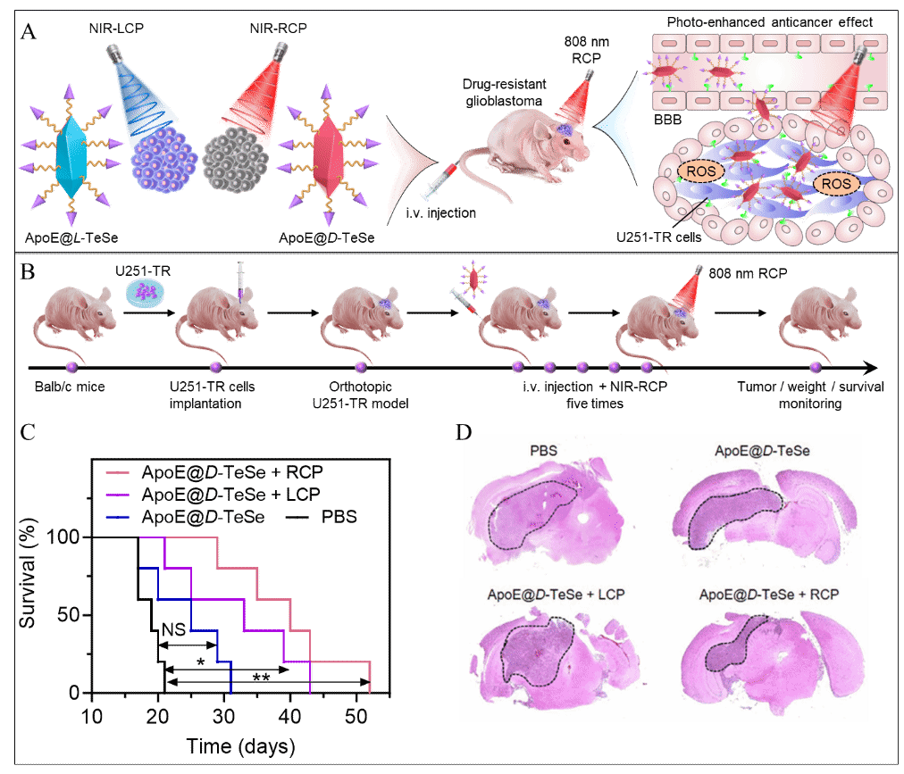 针对以上挑战,该工作成功构建了具有近红外手性光学特性的ApoE@D-TeSe纳米药物,首次实现了对手性构型、近红外光响应与脑靶向功能的协同整合(如图1所示)。该纳米系统通过D-型手性优先识别、ApoE介导的血脑屏障穿透以及Te/Se活性中心的催化作用,在808 nm右旋圆偏振光激发下高效产生活性氧,进而诱导线粒体功能障碍与Bcl-2/Bax通路介导的细胞凋亡,显著抑制原位耐药胶质瘤的生长,并将荷瘤小鼠的生存期延长至52天,展现出优异的治疗潜力与生物安全性。