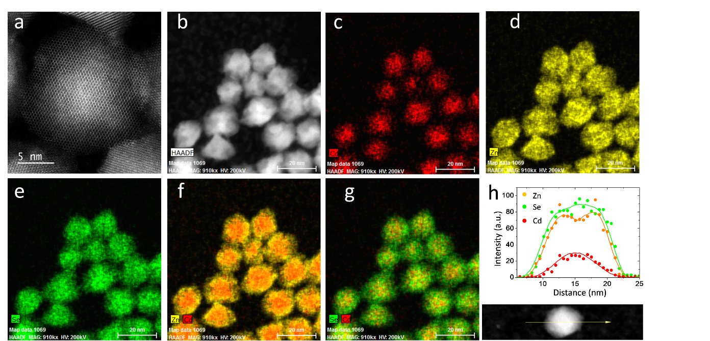 (图1. CdSe/ZnSe 核壳结构量子点球差电镜图,取自中科大林岳博士)