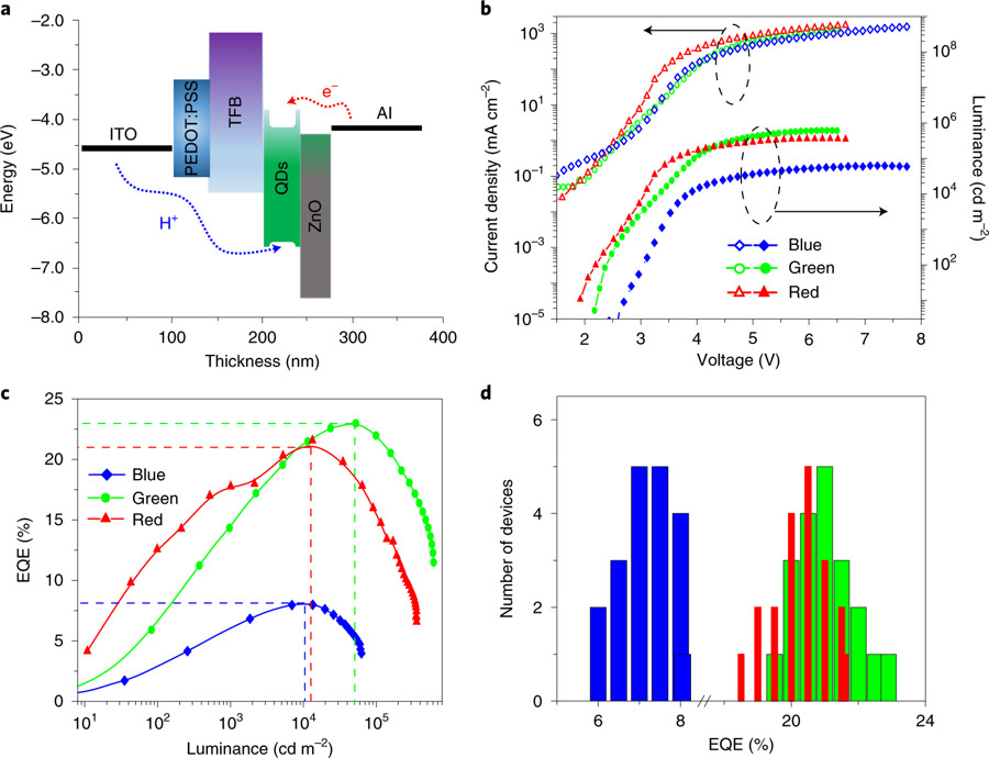 20世纪90年代氮化镓基高亮度蓝光LED的突破,开启了LED照明和显示的新时代(三位日本科学家因此贡献获得了2014年诺贝尔物理学奖)。基于半导体量子点的QLED,由于具有更好的单色性、色彩饱和度和较低的制备成本等优点,在显示和照明领域展现出广阔的应用前景。经过近几年的快速发展,其发光亮度、外量子效率(EQE)和寿命等主要性能指标都得到了大幅度提升。但在以往的工作中,器件存在高亮度时效率太低、高效率下亮度太低的矛盾。如何使器件在高亮度的同时保持高效率、且具有长寿命和高稳定性,是QLED领域亟待解决的难题,也是制约其在显示和照明领域应用的关键技术瓶颈。